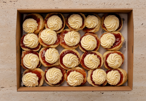 Devonshire Tea Platter Freshly baked scones, halved and topped with strawberry conserve and whipped cream. Each platter contains 10 scones (20 pieces). |