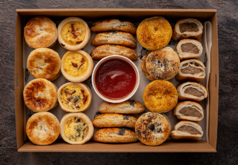 Perryman’s Favourites – Savoury A mixed platter of our savoury pastries. Heated, and packaged in a square platter box. Includes sauce. Price is per person. |