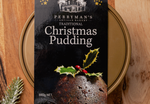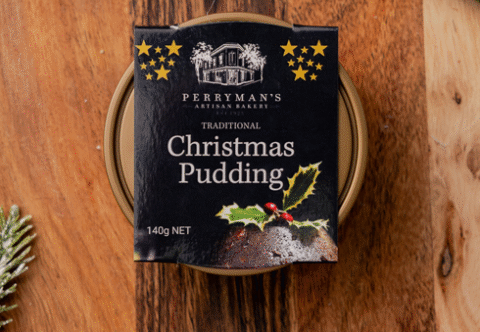Christmas Pudding – Small Individual Serve. A traditionally made steamed Christmas pudding, packed with dried fruits, spices, brandy and rum. Finished with festive Perryman's packaging. |