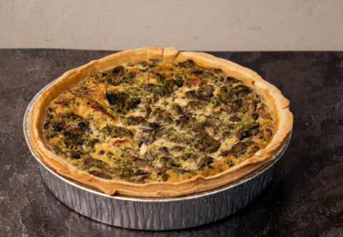 Deep Dish Quiche 12 inch round quiche, served in a foil tray. Serves 6-8. |