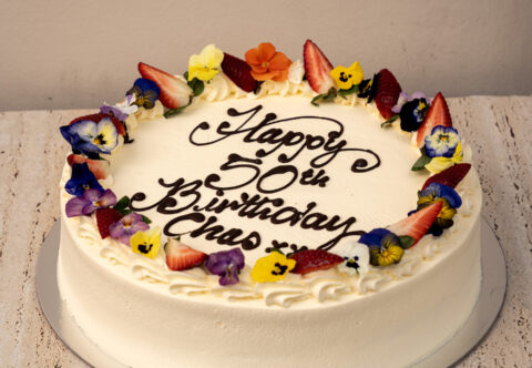 Sponge Cake A traditional sponge cake filled with strawberry conserve and fresh cream, masked with cream and finished with your selected options. |